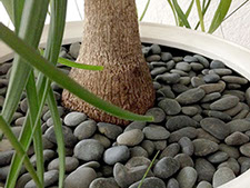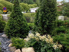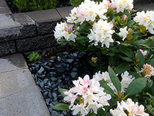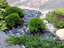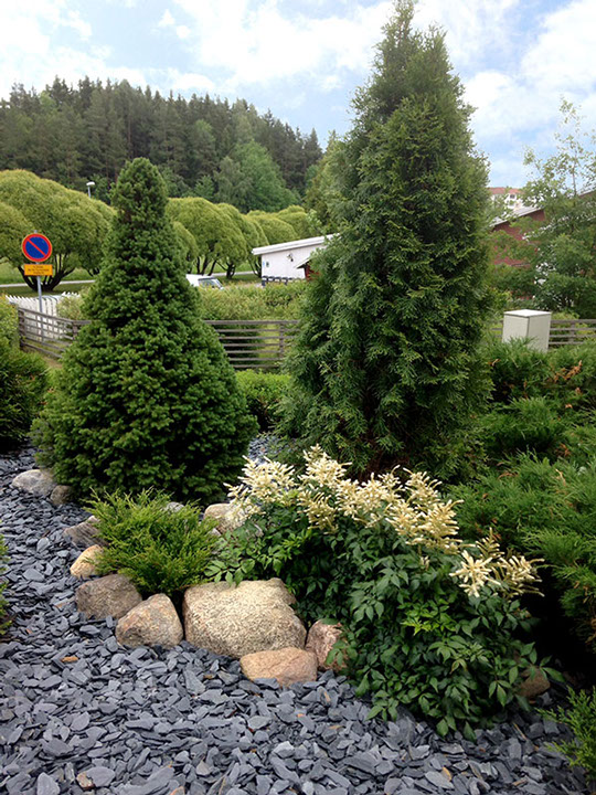 Havuistutus kallion juurella katteena liuskekivimursketta.